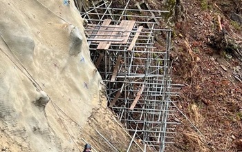 現場や土地の形状などによって、通常の足場を設置することが困難な場合でも、設置することが可能になる足場です。上から吊り下げる足場なので、横方向への広範囲な作業も可能になります。
